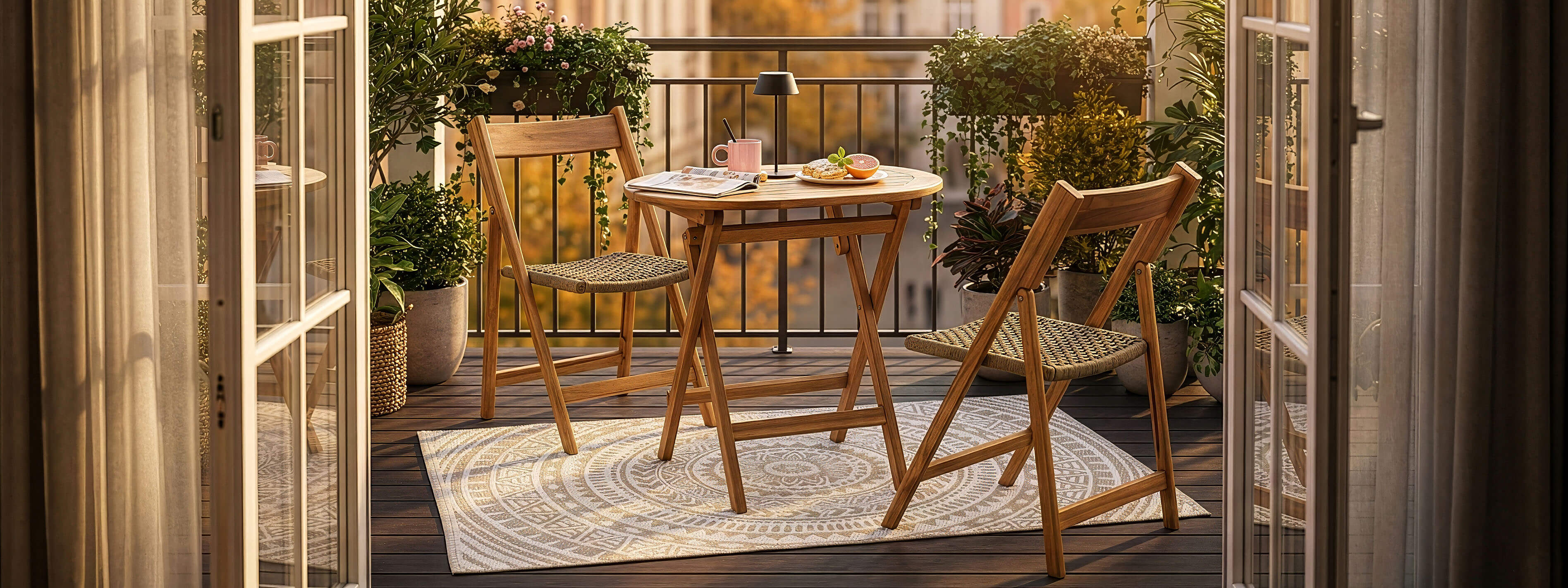 Aber auch auf kleinen Balkonen lässt sich hoher Wohnkomfort herstellen: Klappbare Balkonmöbel lassen sich platzsparend verstauen und je nach Bedarf und Gästeanzahl aufstellen. Ein modischer Sonnenschirm ist zudem nicht nur dekorativ, sondern schützt auch zuverlässig gegen allzu starke UV-Strahlung und Hitze. Und mit einem Outdoor-Teppich in wunderbaren Mustern und Farben wird es draußen mindestens genauso gemütlich wie drinnen im Wohnzimmer.