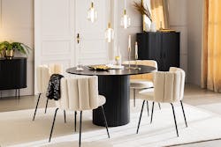 Hier sitzen sich alle gegenüber: Runde oder organische Esstische fördern die Kommunikation und gelten so als besonders gesellige Modelle. Sie lassen sich flexibel im Esszimmer platzieren und sind ideal, um Bewegungsfluss und Offenheit zu betonen. Ohne Ecken und Kanten wirkt der Tisch außerdem schön harmonisch und vergrößert optisch den Raum.