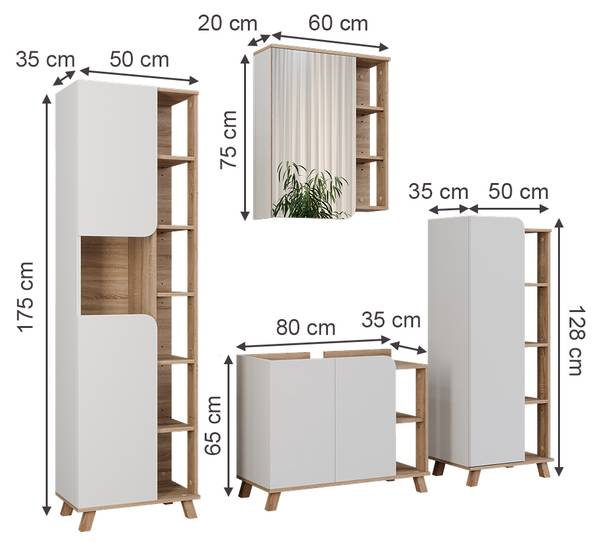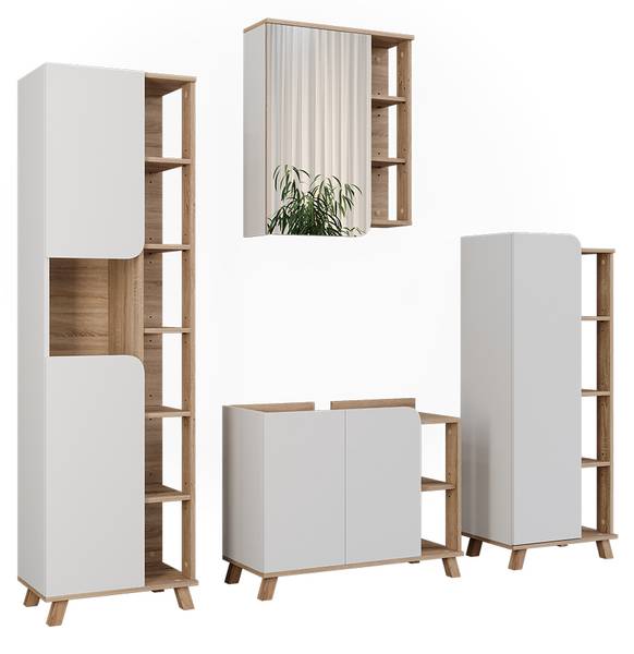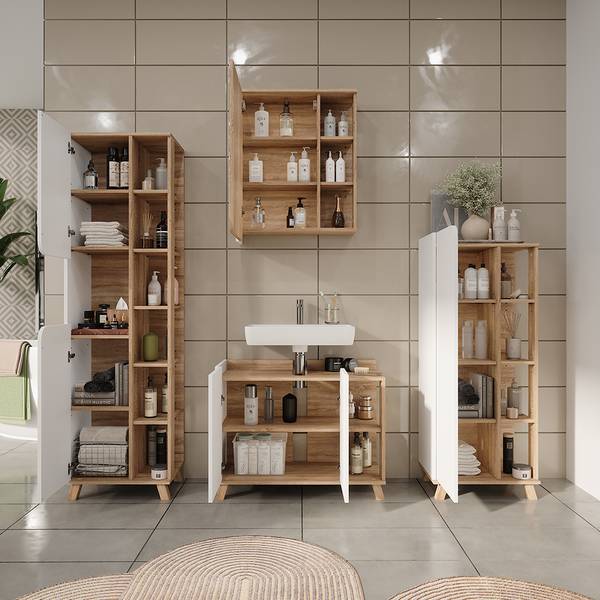 LIEFERUMFANG: Waschbeckenunterschrank, Badspiegelschrank, Badregal, Hochschrank, Montageanleitung, Montagematerial (Dekoration nicht enthalten)