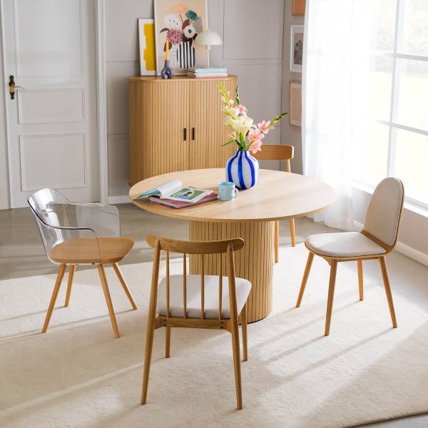 Serie Barawoh zeichnet sich durch ein einzigartiges Design aus, denn hier verbreiten abgerundete Kanten sowie Fronten in Lamellenoptik puren Retro-Charme in deinem Zuhause. Gefertigt aus lackiertem und furniertem Eichenechtholz umfasst das Seriensortiment vielseitige Stauraummöbel, wie z. B. Sideboard, Couchtisch (praktisch mit integriertem Fach!) sowie eine Nachtkommode. Darüber hinaus bietet Barawoh einen Esstisch und einen Schreibtisch im angesagten Konsolentisch-Design. Die meisten Barawoh-Möbel sind in zwei Farben erhältlich: klassisch-elegant in Schwarz oder natürlich in Eiche.