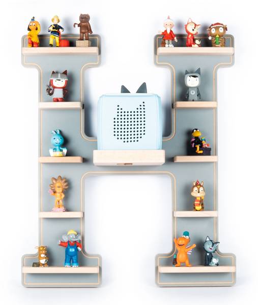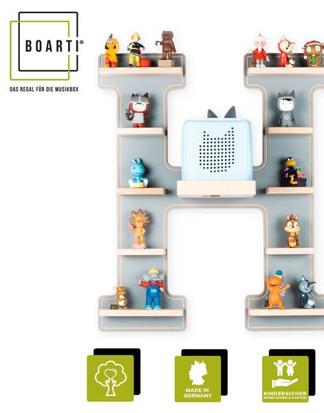 BOARTIs mit Buchstaben im College Style - hier ist jedem gleich klar, wem die Toniebox samt Sammlung gehört! Ein klares Statement-Board fürs Kinderzimmer. Aufgeräumt und stylisch: hier finden Ladestation und Figuren ihren Platz. Keine herumfliegenden Figuren mehr. Um die Figuren sicher auf dem Regalboden befestigen zu können, hat der Designer serienmäßig Metallstreifen integriert, damit die Figuren schön an Ort und Stelle bleiben.