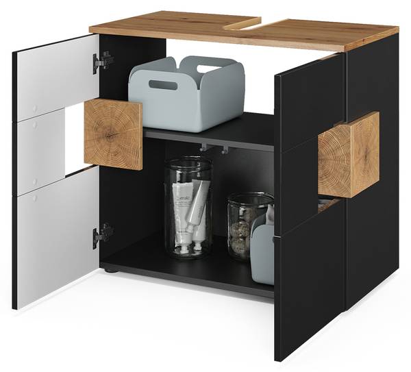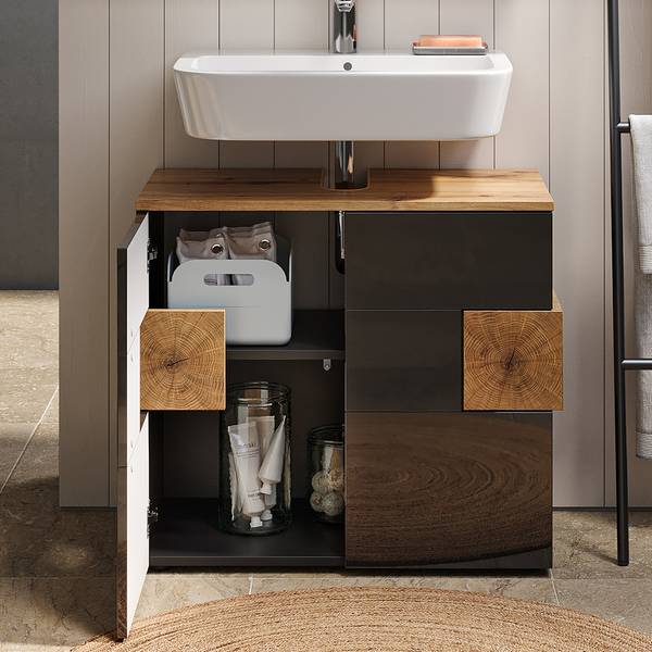 Der Waschbeckenunterschrank Eden ist ein innovatives und stylisches Möbelstück für Ihr Badezimmer. Er verfügt über zwei Flügeltüren und einer geschlossenen Ablagefläche und bietet so genügend Stauraum für all Ihre Badezimmerutensilien. Die Aussparung für den Siphon sorgt dafür, dass das Möbelstück auch in kleinen Bädern Platz findet. Der Waschbeckenunterschrank Eden ist kompatibel mit anderen Produkten der Kollektion Eden und sorgt so für ein harmonisches Gesamtbild in Ihrem Badezimmer.