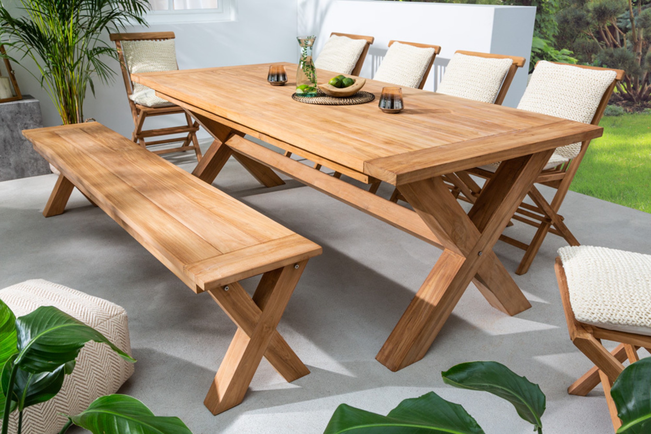 Teakholz verwittert sehr langsam – seine natürlichen Öle schützen es, sodass es auch nach Jahren im Freien kaum an Stabilität verliert. So trotzen deine Teakmöbel auch ständig wechselndem Wetter und Regen, und mit ein bisschen Pflege hält Teak problemlos mehrere Jahrzehnte.