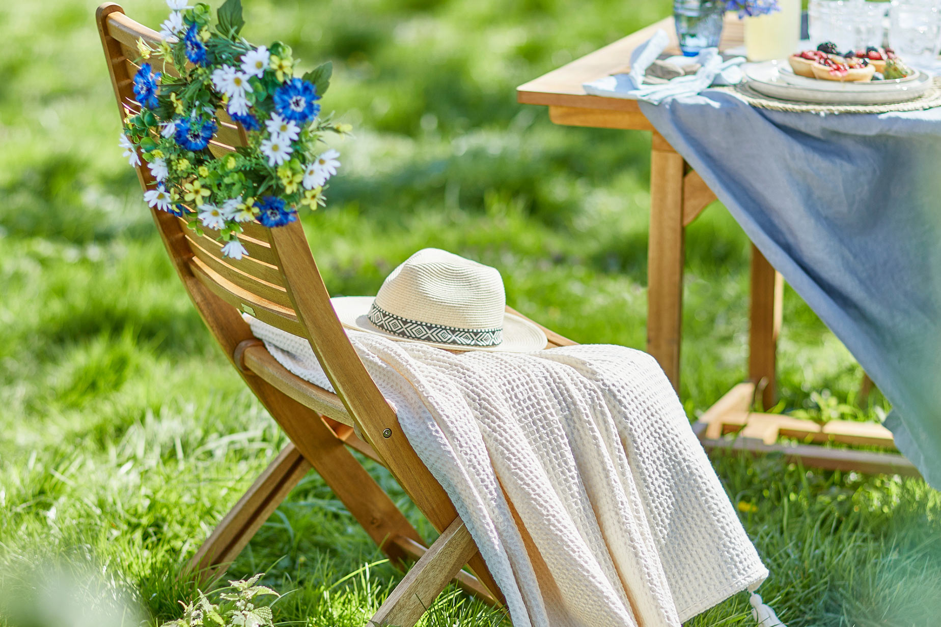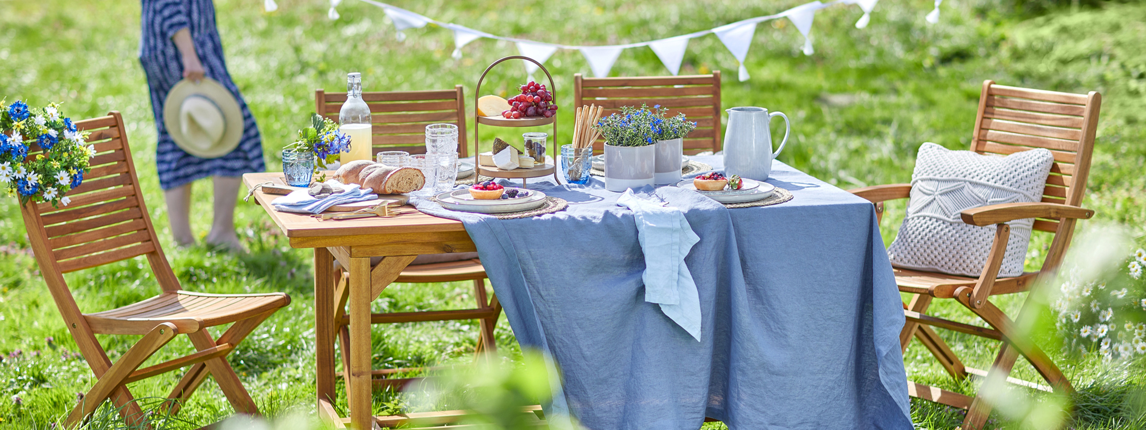 Was gibt es Schöneres, als draussen in seinem Lieblingsstuhl zu chillen und sich einfach die Sonne ins Gesicht scheinen zu lassen? Dazu erfrischende Drinks und ein üppiges Picknickbüfett, und der Tag kann nicht besser werden. Farblich abgestimmte Textilien bringen Harmonie und Verweillust ins Schlemmer-Setting.