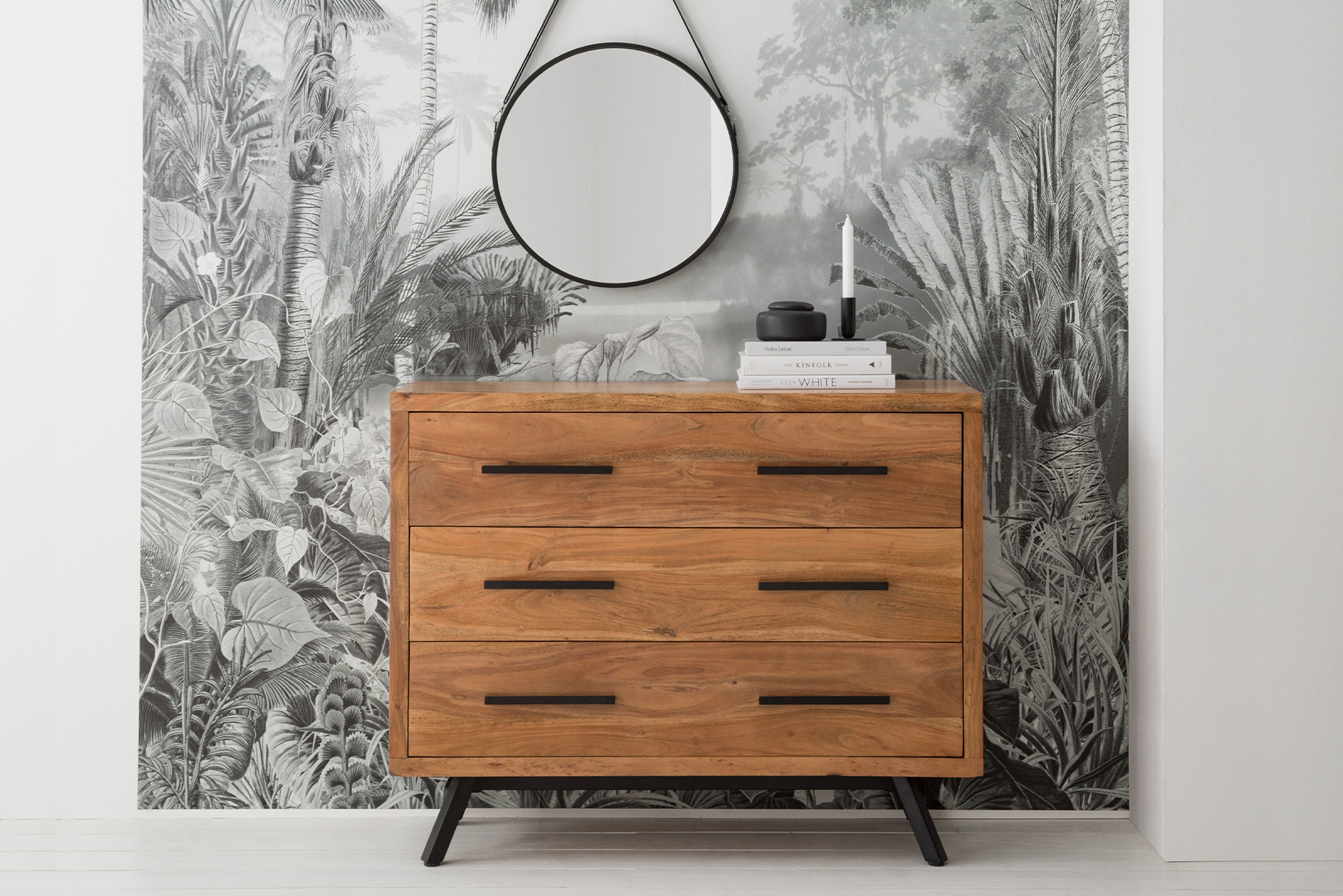 Diese Kommode aus massivem Akazienholz fügt sich gekonnt in das natürliche Farbschema aus Beige- und Grautönen ein und addiert durch coole Eisenkomponenten und ihre roughe Fassade eine kontrastreiche, kühlere Note zur sonst warm wirkenden Basis in Nudes.