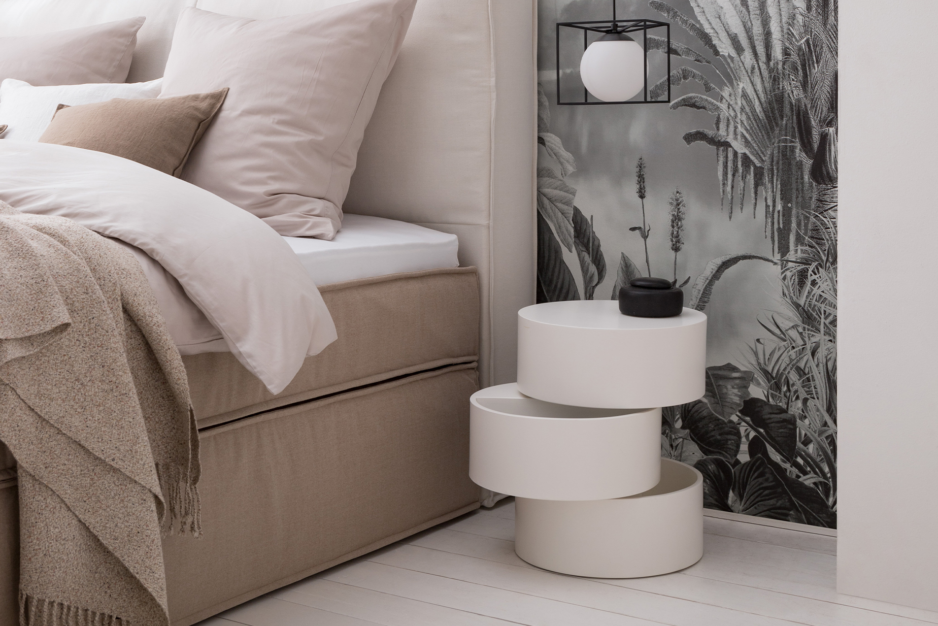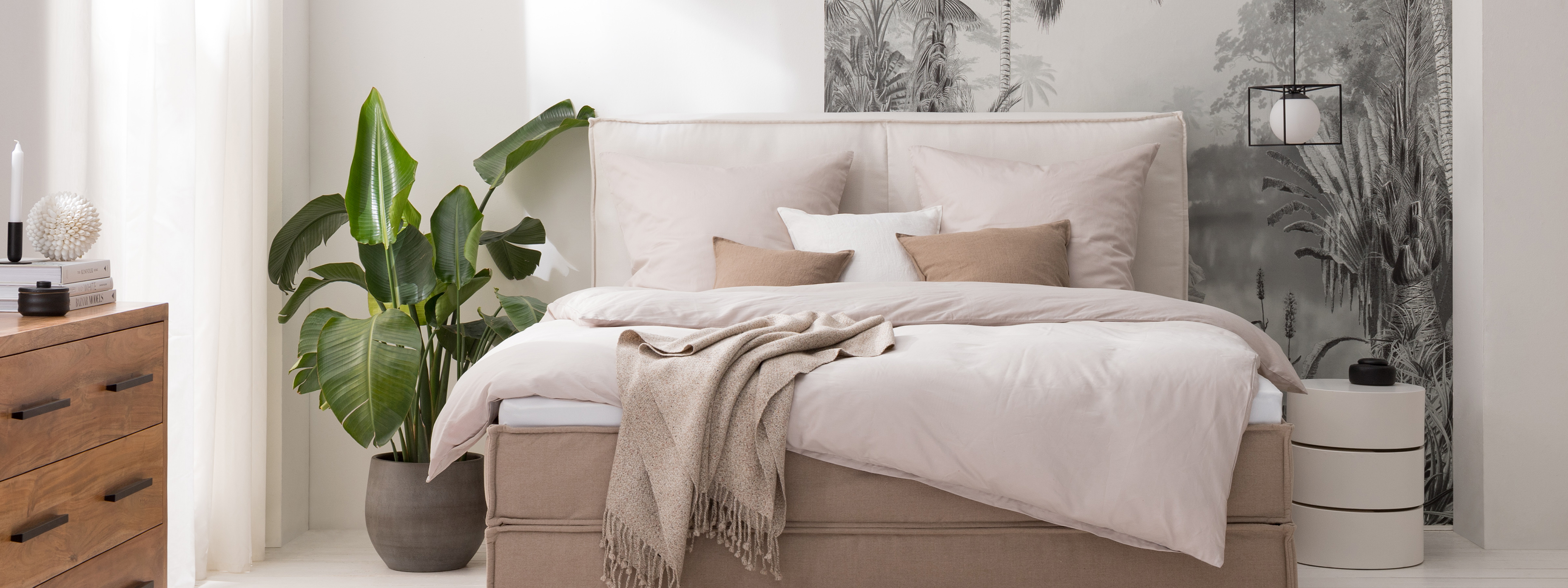 Ein Boxspringbett in Sandtönen, dazu helle, cremefarbene Textilien in Kombination mit weiss-grauen Deko-Elementen wie Pflanzenkübel und Fototapete sorgen im Mix für ein lichtes, harmonisches Schlafzimmer-Setting, das Ruhe, Geborgenheit und Natürlichkeit ausstrahlt. Möbelstücke im Industrial-Look mischen das Ambiente mit coolem Charakter wirkungsvoll auf.