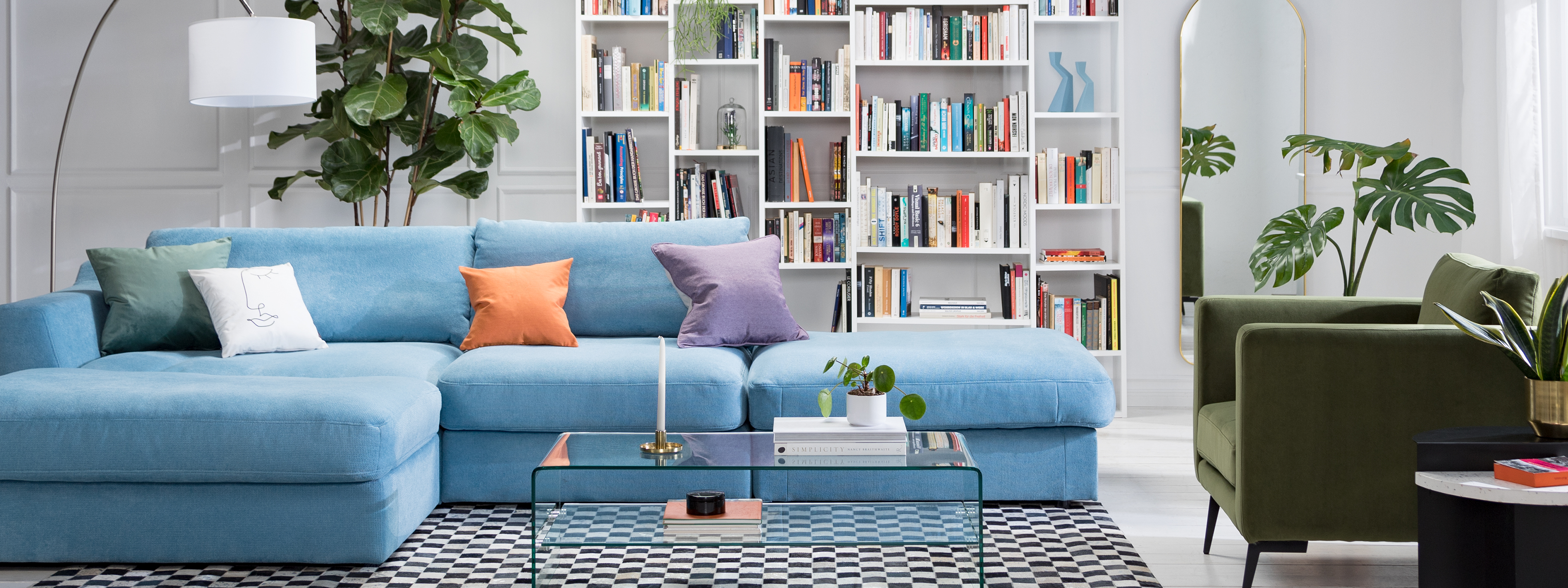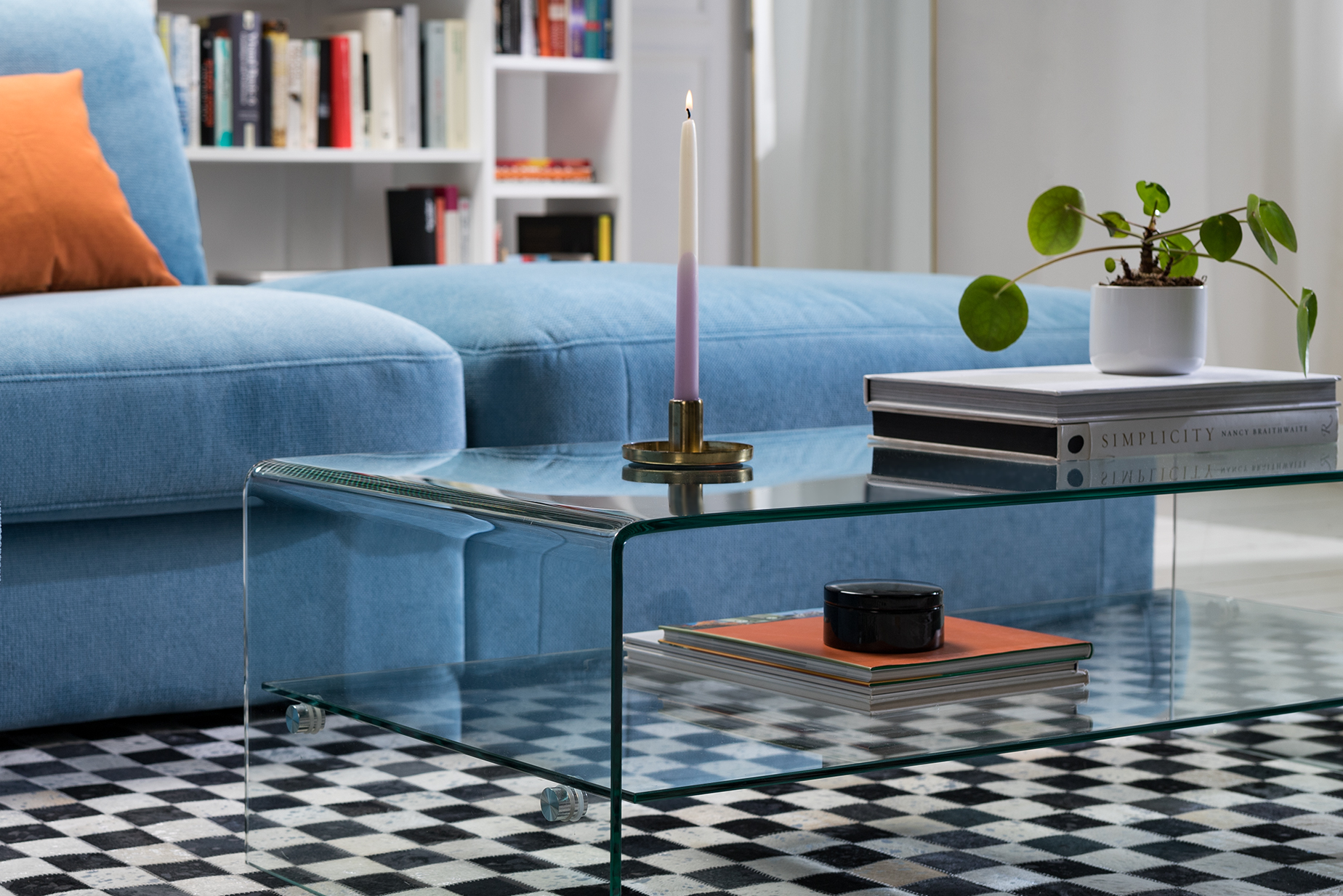 Bring mit fröhlichen Farben wie Poolblau, Orangensorbet und Palmengrün mehr Lebendigkeit in dein Wohnzimmer. Karierte Muster sorgen für Schwung, halten sich jedoch in ihrer schachbrettartigen Geradlinigkeit zurück und lassen den farbenfrohen Frühlingstupfern den Vorrang.