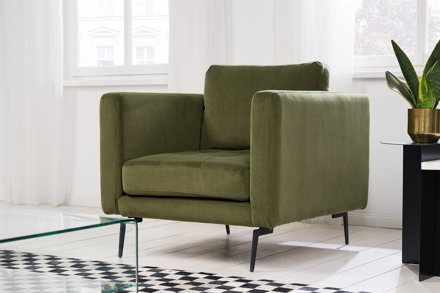 Darf's ein bisschen Retro sein? Auch in sonst moderner Umgebung machen Pieces in Retro-Shapes immer eine gute Figur. Dieses Prachtstück in gedecktem Grün und edlem Samt zieht mit schwarzen schmalen Füßen in Mid-Century-Manier alle Blicke auf sich und fügt sich durch seine kantigen Linien formschön ins straighte Setting ein.