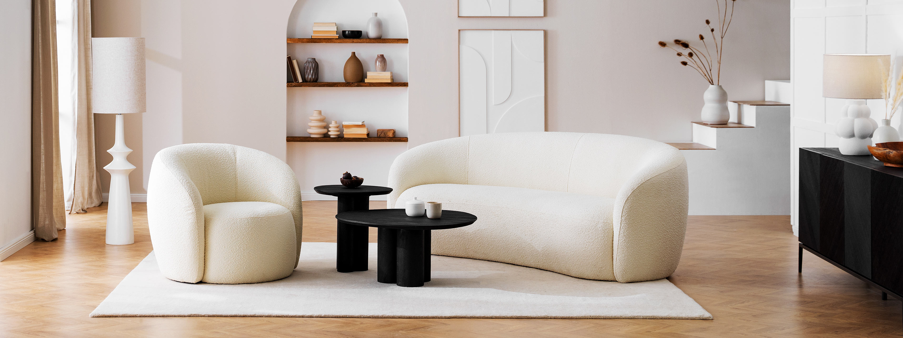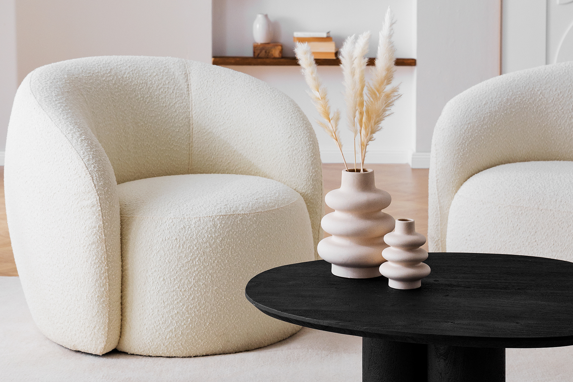 Eine runde Formgebung von Möbeln und Accessoires gleitet stilvoll durch den Raum und bringt diesen ins Gleichgewicht. Die organischen Linien wiederholen sich dabei im gesamten Setting – ob der curvy Sessel, ein Couchtisch im angesagten Chunky Design oder der skulpturale, artsy Look der Vasen.