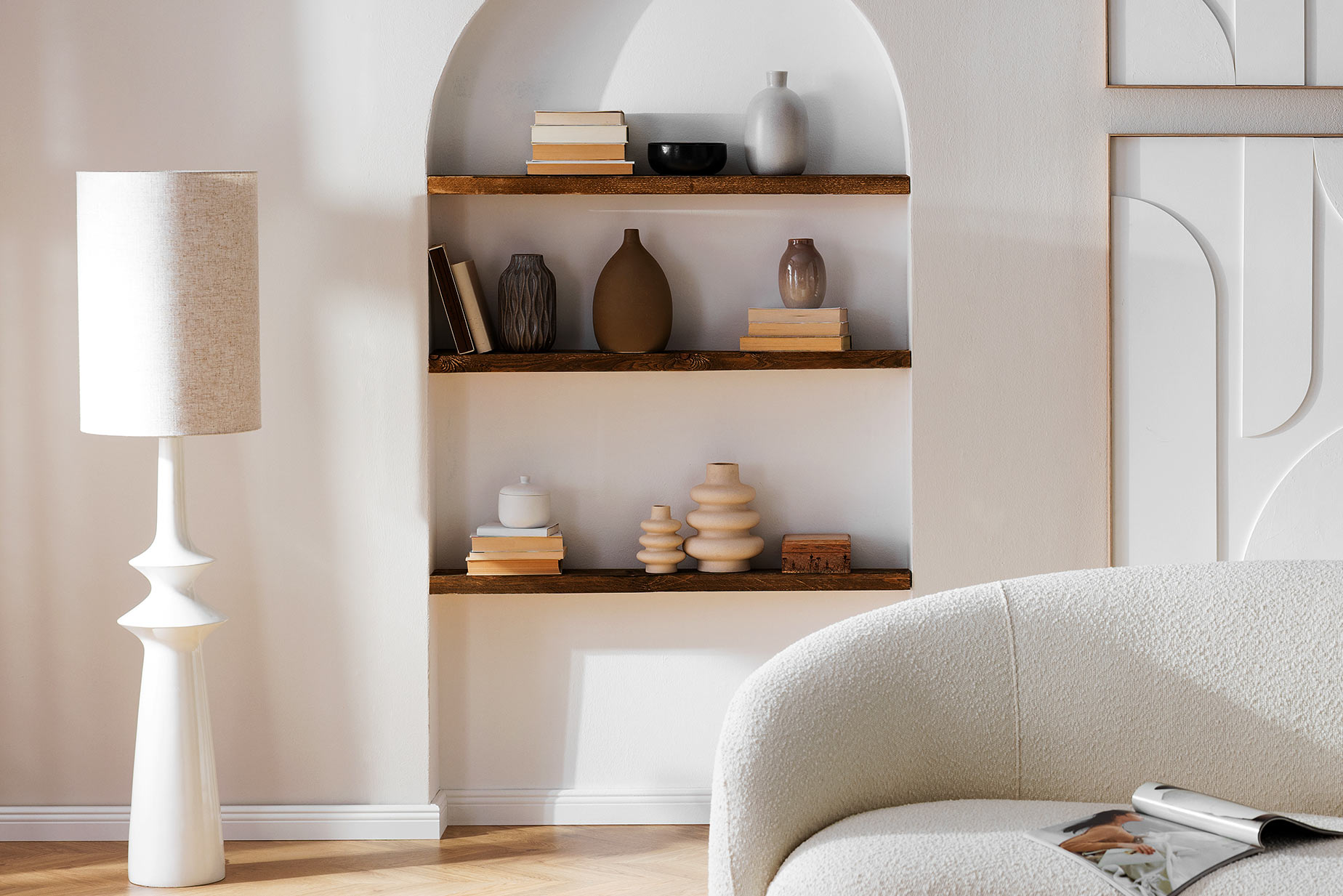 Dieses Wohnzimmer im minimalistischen, natürlichen Look entfaltet dank warmer Farbpalette in Earthy Tones eine beruhigende Wirkung. Geschwungene, organische Formen an Sofa, Tisch und Lampen füllen den Raum mit Harmonie, während Deko mit Handmade-Charakter aus Keramik oder rustikalem Holz um noch mehr Natürlichkeit ergänzt.
