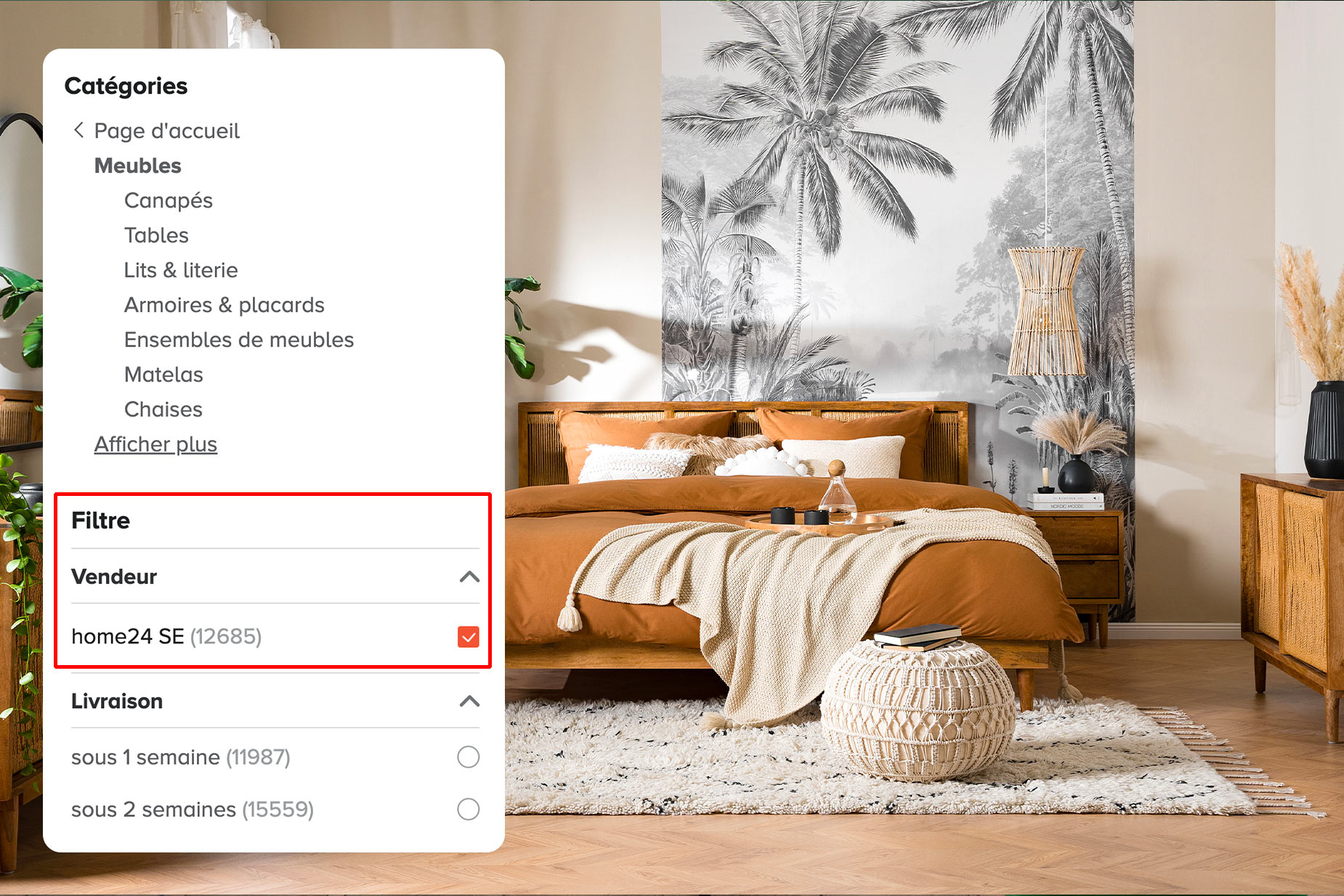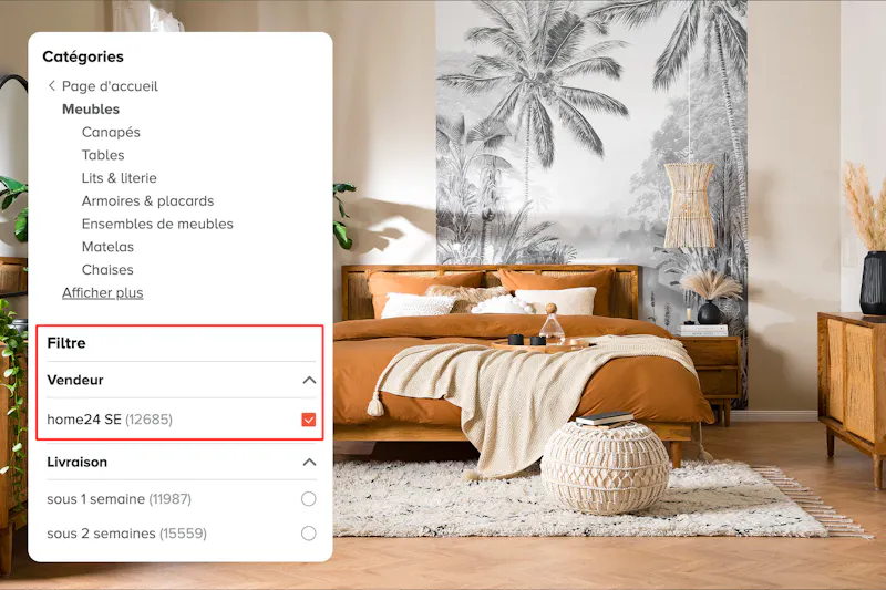 Pour voir à quels produits vous avez accès, cliquez ci-dessous ou utilisez le filtre « Vendeur : home 24 SE » disponible sur chaque catégorie de produits. Trouvez l'article de vos rêves parmi nos milliers de références meubles et déco.